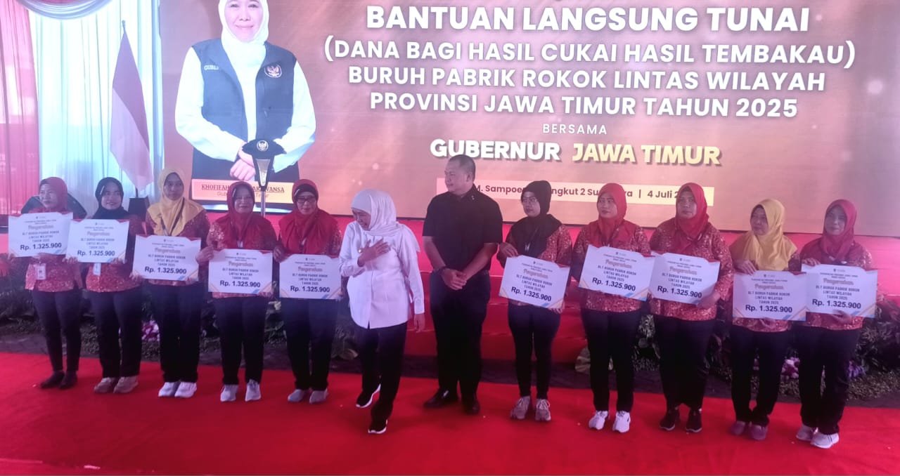 Surabaya Motim – Gubernur Jawa Timur Khofifah Indar Parawansa menyerahkan Bantuan Langsung Tunai (BLT) Dana Bagi Hasil Cukai Hasil Tembakau (DBHCHT) kepada buruh pabrik rokok lintas wilayah tahun 2025.