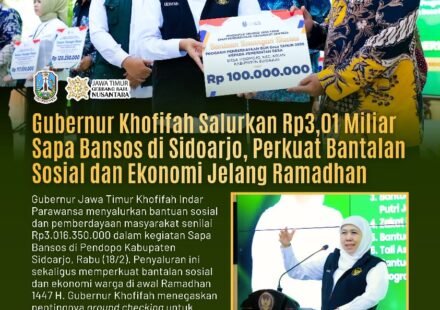 Surabaya Motim – Gubernur Jawa Timur Khofifah Indar Parawansa menyalurkan bantuan sosial dan pemberdayaan masyarakat desa di Sidoarjo senilai total Rp3.016.350.000 dalam kegiatan Sapa Bansos yang digelar di awal Bulan Suci Ramadhan 1447 Hijriah di…
