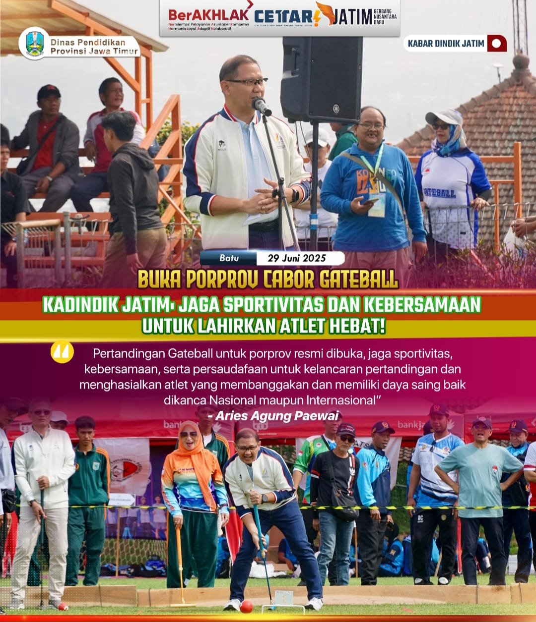 Surabaya Motim – Ketua Umum Pengprov Persatuan Gateball Seluruh Indonesia (Pergatsi) Jawa Timur, Aries Agung Paewai secara resmi membuka cabang olahraga (cabor) gateball dalam rangkaian Pekan Olahraga Provinsi (Porprov) IX Jawa Timur 2025.…