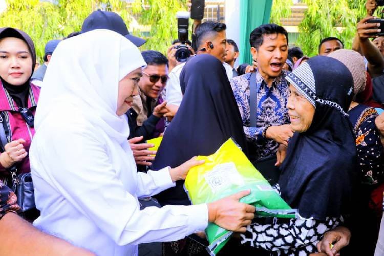 Gubernur Jatim Khofifah Indar parawansa menyempatkan hadir untuk melihat langsung pendistribusian bahan pokok murah kepada masyarakat sekitar.