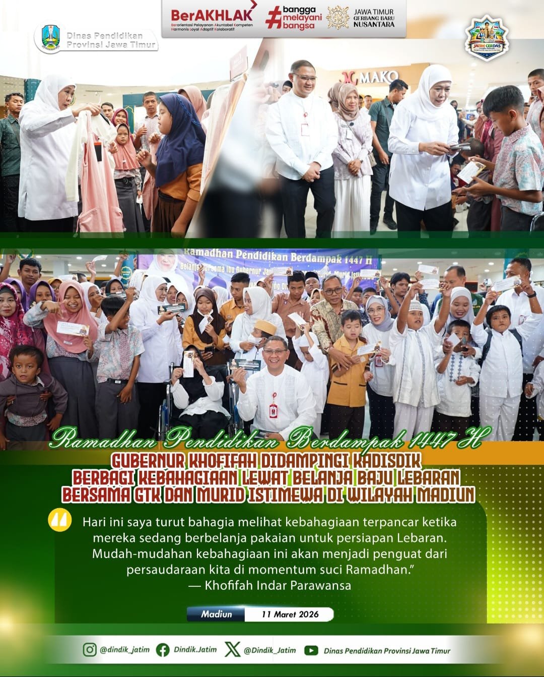 Madiun Motim – Gubernur Jawa Timur, Khofifah Indar Parawansa berbagi kebahagiaan dengan 95 murid berkebutuhan khusus dari Kota dan Kabupaten Madiun dengan mengajak mereka berbelanja kebutuhan Lebaran di Sun City Mall Madiun, Kamis (12/3/2026).