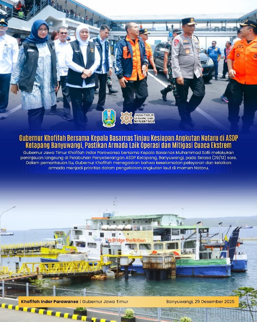 Surabaya Motim – Gubernur Jawa Timur Khofifah Indar Parawansa bersama Kepala Basarnas Marsekal Madya TNI Muhammad Safii meninjau kesiapsiagaan kebencanaan laut serta pelayanan angkutan Natal 2025 dan Tahun Baru 2026 (Nataru) di Pelabuhan Penyeberangan ASDP Ketapang, Banyuwangi, Senin (29/12).