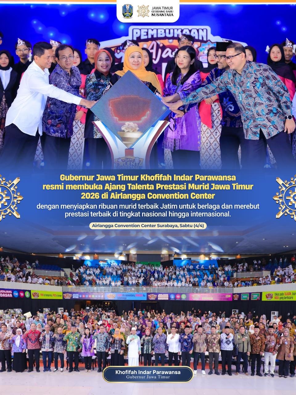 Surabaya Motim – Gubernur Jawa Timur Khofifah Indar Parawansa resmi membuka Ajang Talenta Prestasi Murid Jawa Timur 2026 di Airlangga Convention Center Surabaya, Sabtu (4/4), dengan menyiapkan ribuan murid terbaik Jatim untuk berlaga dan merebut prestasi terbaik di tingkat nasional hingga internasional.
