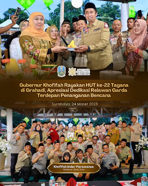 Surabaya Motim – Gubernur Jawa Timur (Jatim) Khofifah Indar Parawansa menggelar tasyakuran HUT ke-22 Taruna Siaga Bencana (Tagana) bersama pilar sosial di Gedung Negara Grahadi, Surabaya, Selasa (24/3/2026).