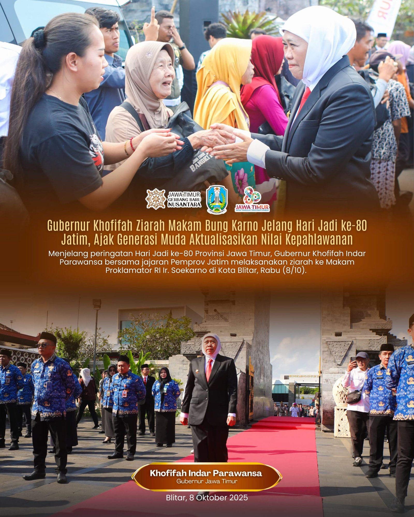 Surabaya Motim – Jelang Hari Jadi ke-80 Pemerintah Provinsi Jawa Timur, Gubernur Jawa Timur Khofifah Indar Parawansa berserta jajaran Pemprov Jatim ziarah makam Proklamator RI Soekarno di Jl. Ir. Soekarno No.152, Bendogerit, Kec. Sananwetan, Kota Blitar, Rabu (8/10).