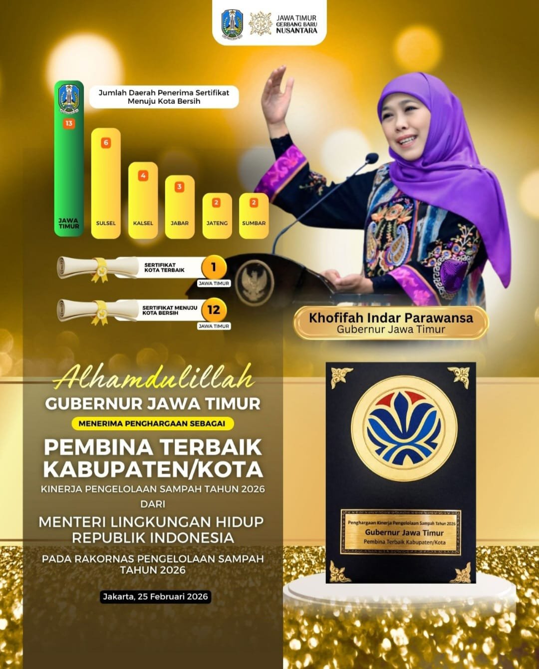 “Alhamdulillah, Jawa Timur mencatatkan capaian tertinggi nasional dalam jumlah kabupaten/kota menuju kota bersih,” tuturnya dalam keterangan tertulis, Rabu (25/2/2026).