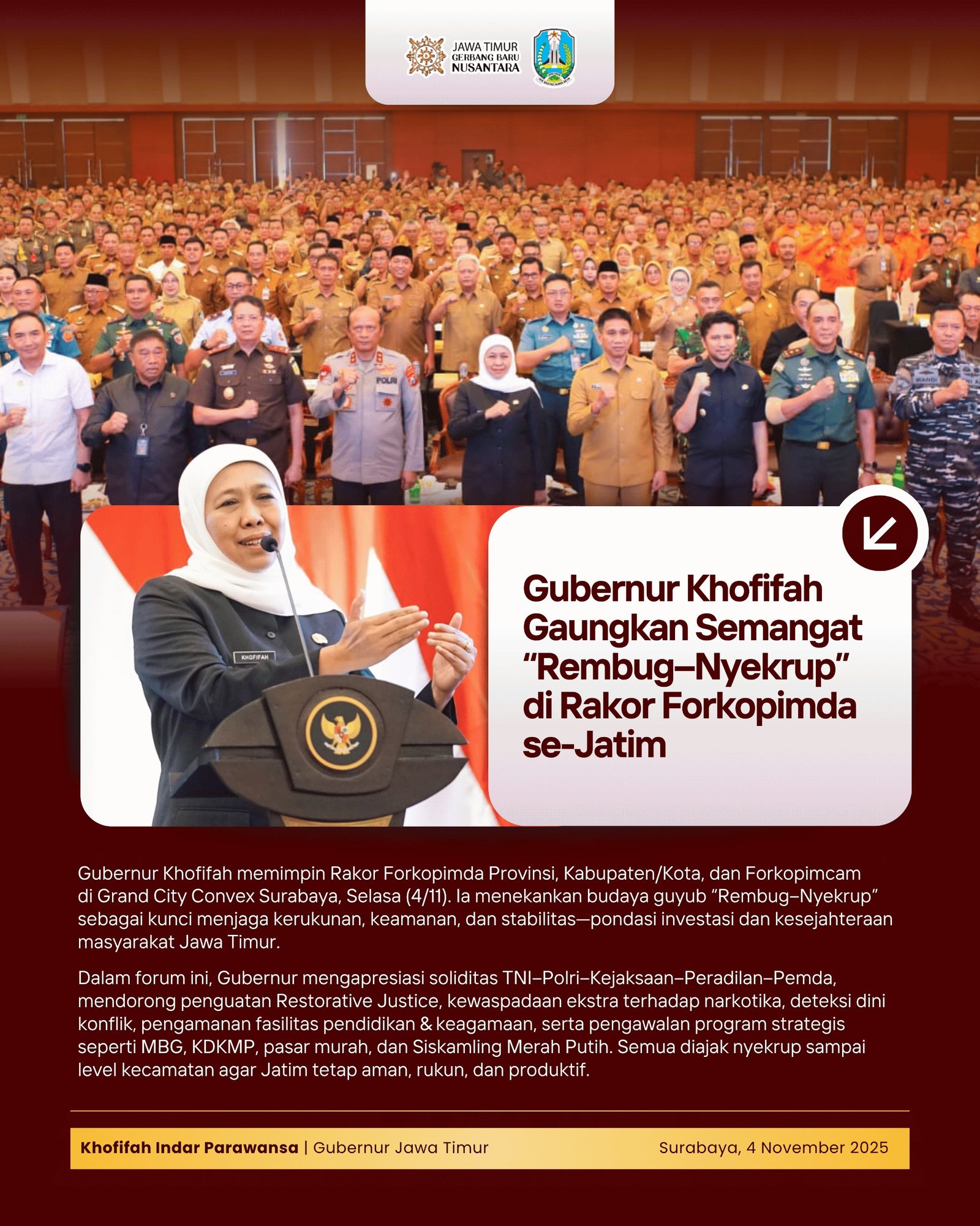 “Kekuatan Jawa Timur adalah solidaritas sosial dan nilai gotong royong. Melalui semangat Rembug–Nyekrup, kita bisa menjaga keamanan sekaligus memperkuat harmoni sosial,” tegas Khofifah.
