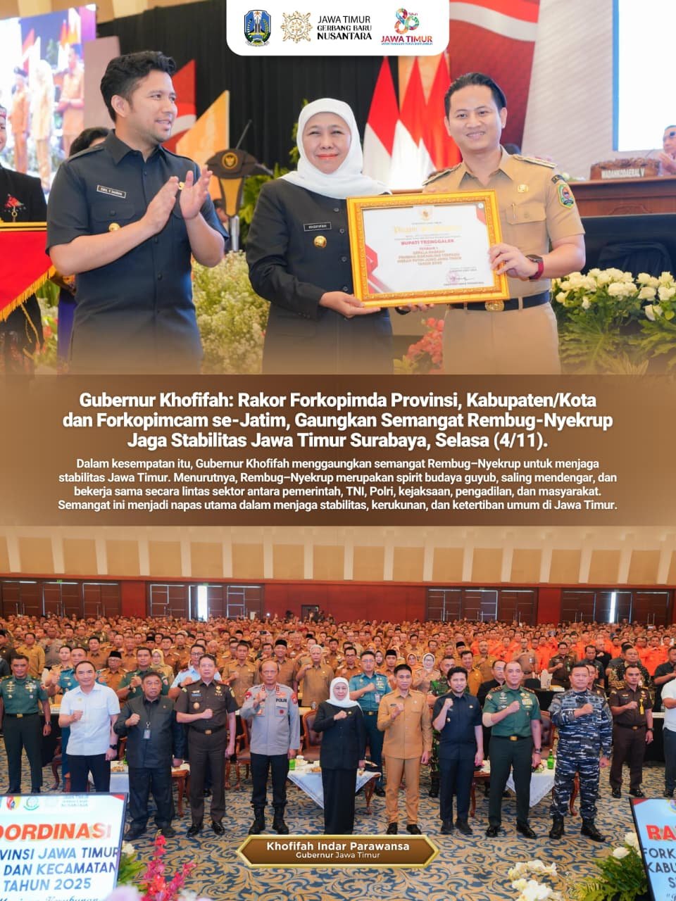 Gubernur Khofifah : Rakor Forkopimda Provinsi, Kabupaten/Kota, dan Forkopimcam se-Jatim, Gaungkan Semangat Rembug–Nyekrup Jaga Stabilitas Jawa Timur