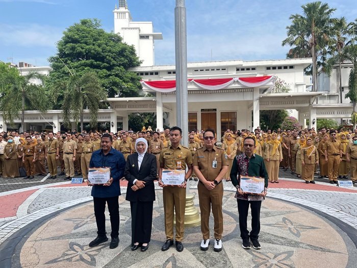 Surabaya Motim – Pemerintah Provinsi Jawa Timur menggelar Apel Pagi bersama Gubernur Khofifah Indar Parawansa di halaman Kantor Gubernur Jatim, Senin (8/9/2025). Kegiatan ini dihadiri jajaran pimpinan Pemprov, mulai dari Sekretaris Daerah, para asisten, kepala perangkat daerah, hingga pejabat eselon III di wilayah Surabaya Raya.