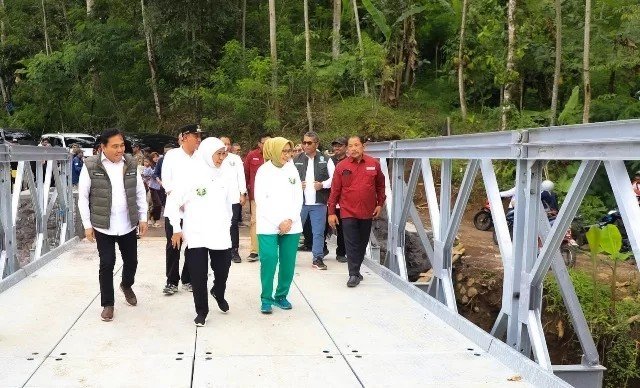“Kita sudah melihat pembangunan jembatan bailey yang kita pesan sudah jadi. Kemudian juga dilakukan pemasangan pondasi serta bronjongnya,” kata Khofifah.