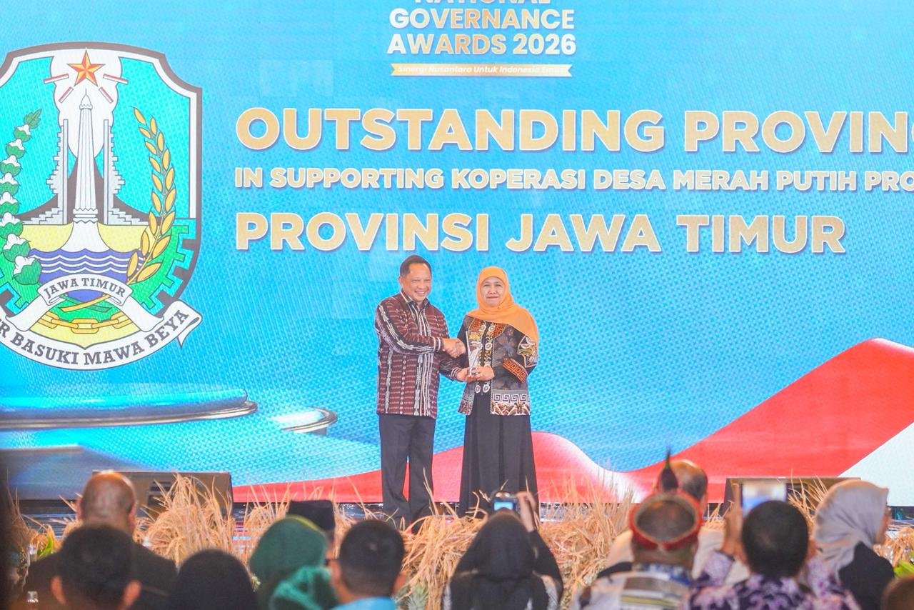 Gubernur Khofifah: Wujud Kerja Kolektif Perkuat Ekonomi Kerakyatan Berbasis Desa , Jatim Raih Penghargaan National Governance Awards 2026 Kategori Outstanding Province in Supporting Koperasi Desa Merah Putih Program