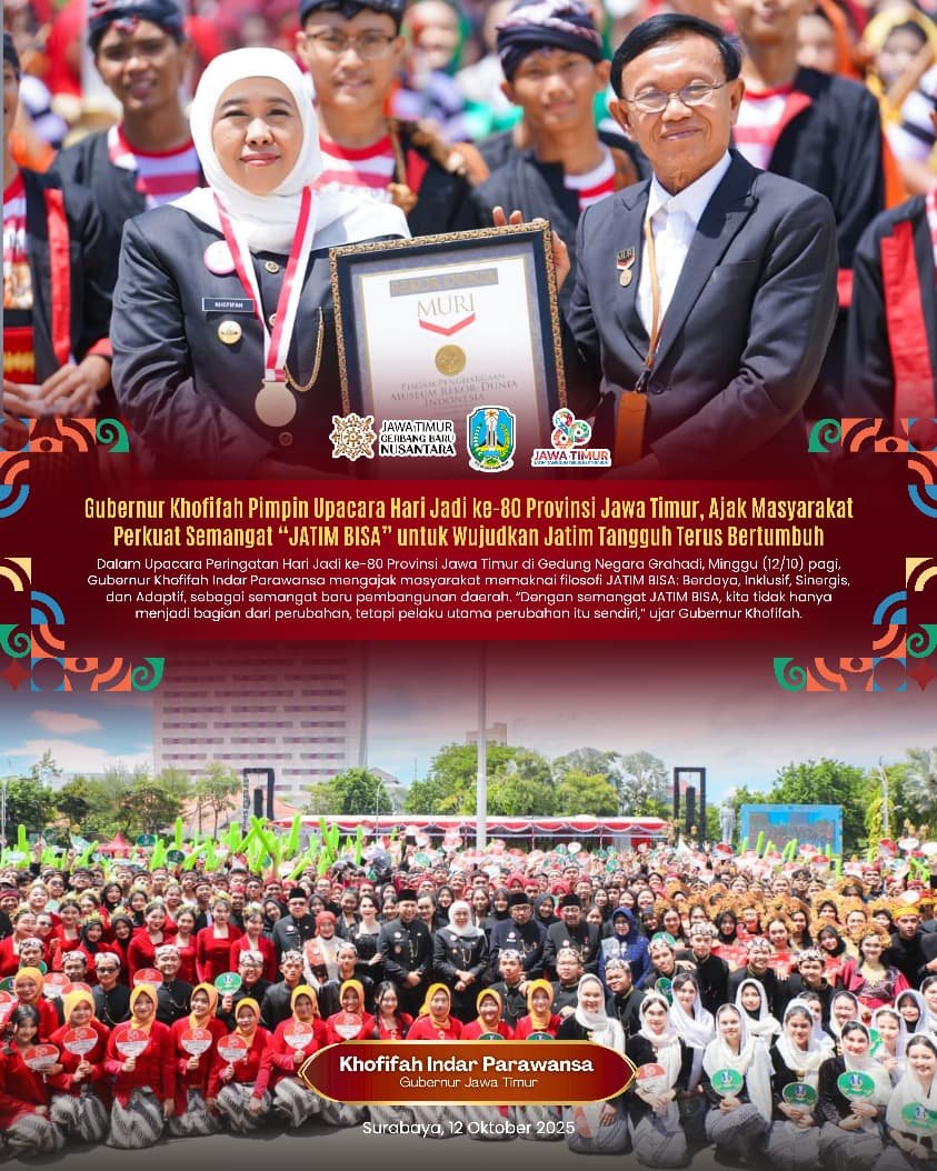 Ajakan tersebut disampaikan Gubernur Khofifah saat memimpin Upacara Peringatan Hari Jadi ke-80 Provinsi Jawa Timur di Gedung Negara Grahadi Surabaya, Minggu (12/10).