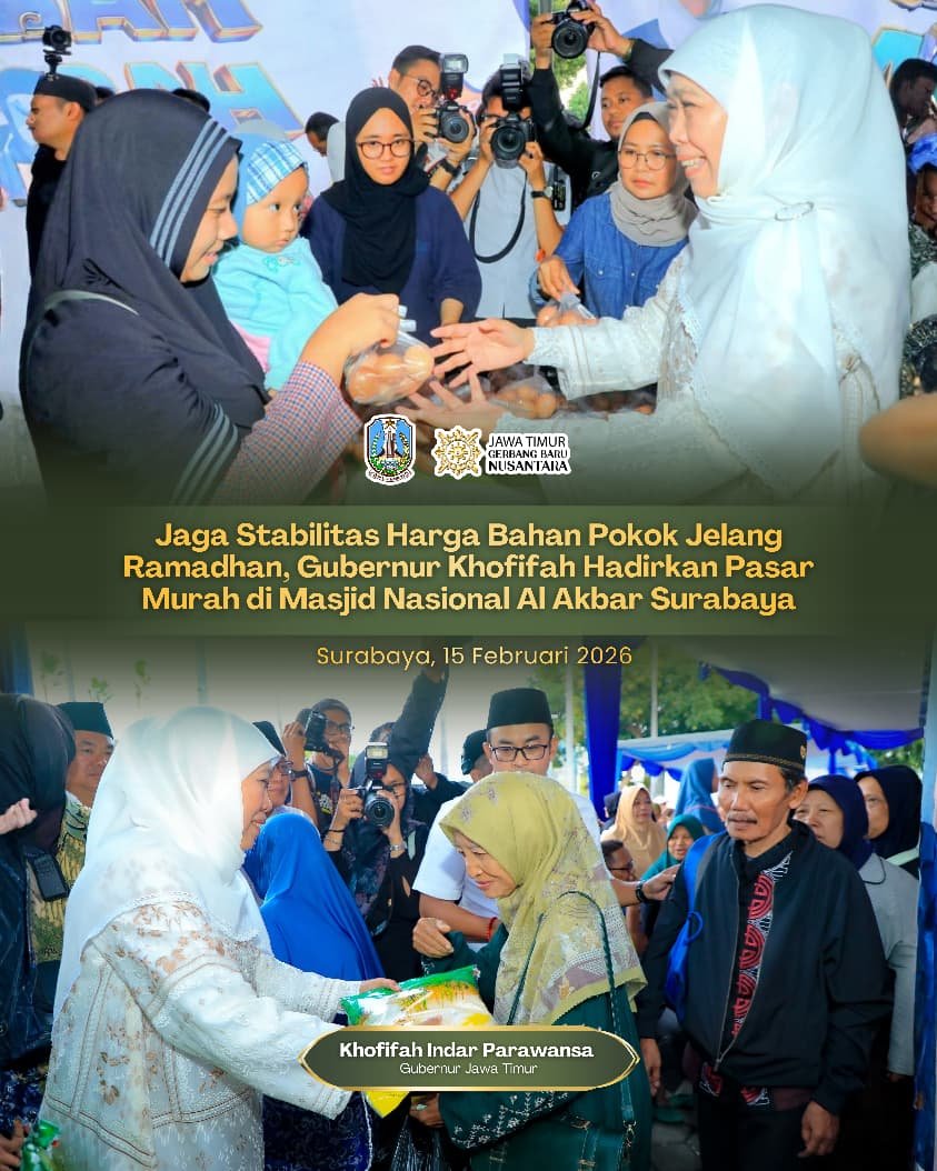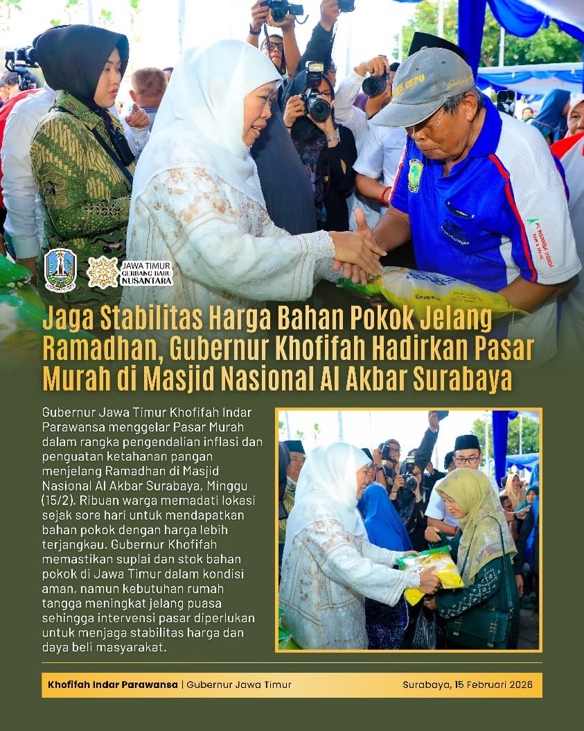 Gubernur Jawa Timur Khofifah Indar Parawansa menegaskan, pasar murah merupakan langkah konkret pemerintah dalam menjaga daya beli masyarakat sekaligus memperkuat ketahanan pangan daerah di tengah meningkatnya kebutuhan konsumsi rumah tangga menjelang Ramadhan.