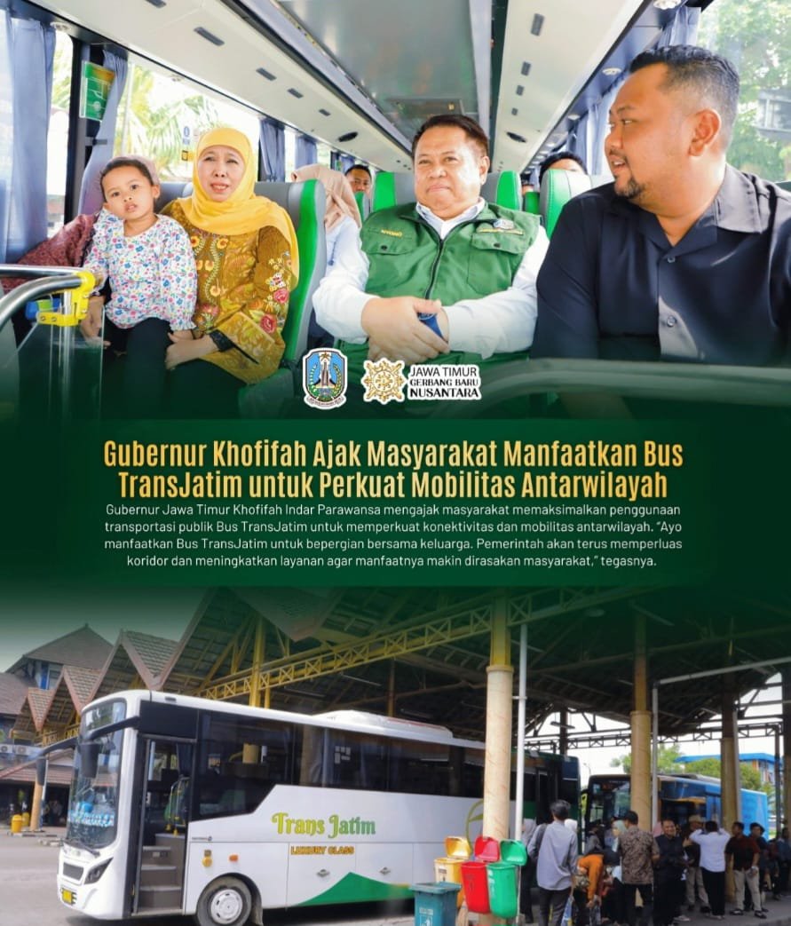 Surabaya Motim – Gubernur Jawa Timur Khofifah Indar Parawansa mengajak masyarakat untuk semakin memanfaatkan transportasi publik Bus Trans Jatim sebagai bagian dari penguatan konektivitas dan mobilitas antarwilayah di Jawa Timur.